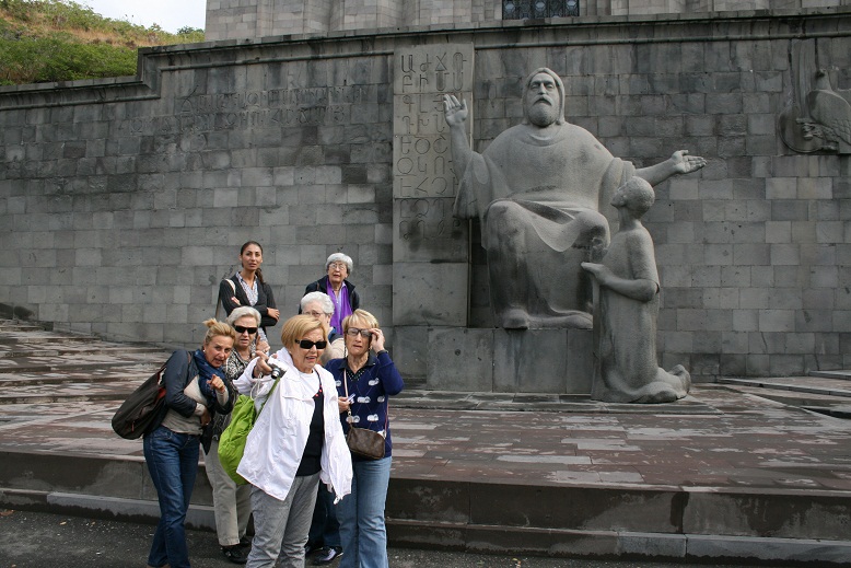 Mi sembra ancora ieri. Poche ore di sonno, la mattina in ufficio, poi di corsa a Malpensa. Volo, Vienna,ancora volo, Yerevan. Arrivati in hotel alle 6 locali: sveglia alle 9,30. Giornata dedicata ai musei della capitale Armena. Dal Mantedaran, l’istituto di ricerca sulla lingua e l’alfabeto armeno, coi suoi libri antichi, fino al museo di storia, passando per quello dedicato al regno Erebuni. In pratica tutto il periodo pre-cristiano. Per finire il vernissage, mercatino molto turistico ma carino, dove mi sono sbizzarrito negli acquisti (segue post ad hoc) e nel fotografare i locals: people watching everywhere. Vi lascio con una foto della mia comitiva, davanti al monumento all’inventore dell’alfabeto armeno.