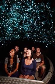Il 31 luglio si sapeva che sarebbe stato uno dei giorni top della nostra vacanza. La prima tappa è stata alle caverne di Waitomo, famose per i vermi fluorescenti. In realtà di tratta di larve che in effetti sono luminose al buio. Vivono attaccate al soffitto della grotta in una sorta di amaca, rilasciando un filamento con cui attirano gli insetti di cui si cibano. Detta così sembra una cosa raccapricciante ma in realtà è spettacolare. Dopo una prima parte del tour in cui ti mostrano un paio di stanze con stalagtiti e stalagmiti, si sale su una barchetta dove, nel buio più totale, si entra in questa area dove si vedono i vermi. Una sorta di volta celeste al coperto, che lascia davvero senza fiato. Per ovvi motivi non si potevano fare foto (e neppure sarebbero venute). Vi metto quindi una foto dal sito ufficiale, un po’ artificiosa nella costruzione ma che rende bene l’idea dello spettacolo.