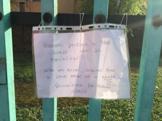 Soprattutto nei condomini, a volte si scatenano vere e proprie guerre a colpi di cartelli, contro ignoti responsabili di determinate infrazioni. Fortunatamente nella mia palazzina viviamo da anni una pace quasi irreale ma andando verso la metropolitana mi sono imbattuto nei due cartelli che vi metto qui sotto. I toni stanno salendo in un crescendo anche di involontaria comicità. Tra l’altro, anche per un caso come questo gli elio e le storie tese hanno una canzone ad hoc.