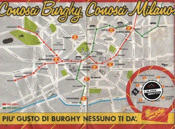 Quando si parla della “Milano che non c’è più, in genere si parla di quella dell’800, coi Navigli scoperti e senza grattacieli. Gli anni però passano e la città cambia, così anche cose più recenti “non ci sono più”. Ieri Il Milanese Imbruttito ha pubblicato la foto che vi allego qui sotto. Si tratta di una vecchia pubblicità di Burghy degli anni 80. Non solo la storica catena di fast food è defunta da anni ma anche la cartina in sé è interessante, dalla linea 3 che ancora non c’era, alla linea 1 che si fermava a Lampugnano. Un bello spaccato storico, a modo suo.