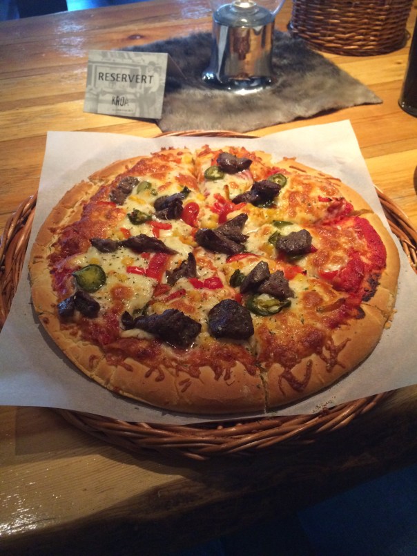 Premessa: io non sono il tipo d’italiano che quando va all’estero cerca disperato pizza, pasta e caffè. Mi piace sperimentare, anche troppo, le cucine locali. L’altro giorno però siamo andati a cena in un locale che ci è piaciuto molto. Ci siamo fatti una zuppa e del filetto. Tutte ricette del posto, molto buone. Il menù però proponeva anche pizze e il giorno seguente, a pranzo, ci siamo lasciati tentare: facciamo la pizza nella pizzeria più a nord del mondo. Alla fine non è che fosse una pizza, era più che altro una focaccia con della roba sopra. Al limite mi ricordava una pizzetta da fare nel tostapane che mangiavo anni fà. Nel suo trash, però non era neppure male. Con la sua carne (forse renna) a pezzettini sopra, il mais e i jalapenos.