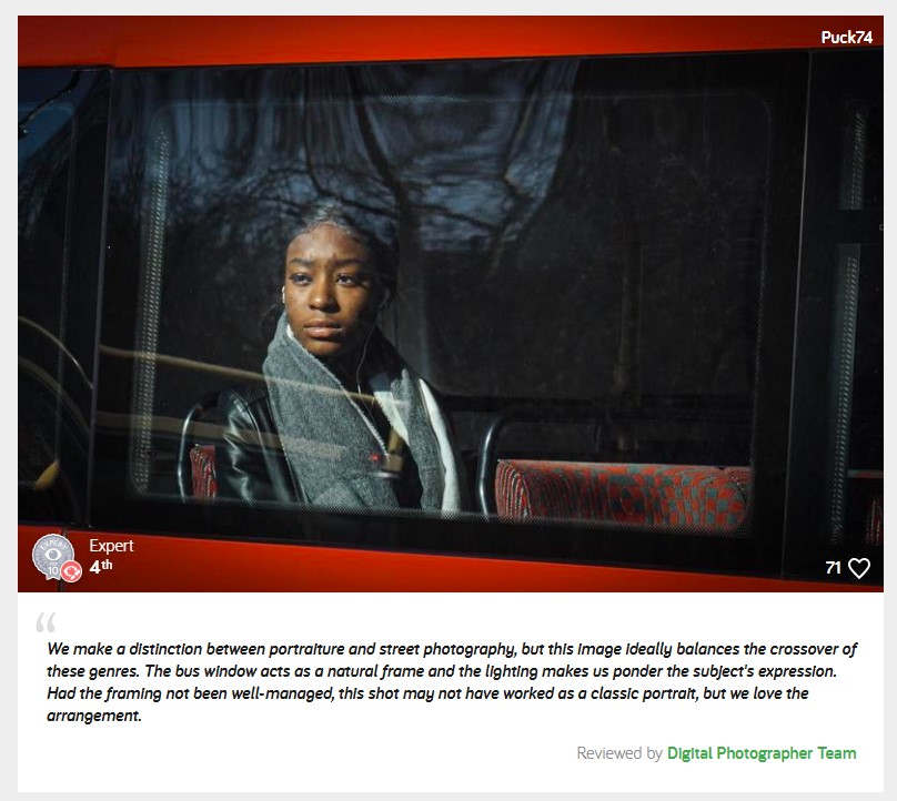 Per una volta lasciatemi bullare. Sono da anni iscritto al sito Photocrowd, un portale di contest fotografici. Quella che vedete sopra è una delle (poche) belle foto che mi è capitato di scattare. Di recente è arrivata quarta (su circa 4500) in un contest (tema ritratti) in collaborazione con la rivista Digital Photographer. In calce alla foto la loro recensione.