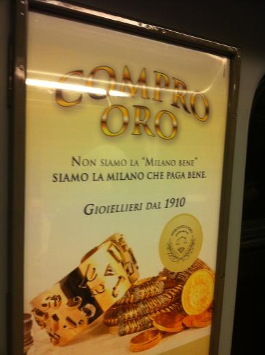 I vari negozi di “compro oro” sono aimè lo specchio dei tempi e soprattutto spesso celano traffici abbastanza loschi, come recenti indagini hanno dimostrato. Il mercato comunque è molto competitivo e le pubblicità sono aggressive. Oggi in metropolitana sono rimasto colpito da questo slogan, che non va troppo per il sottile: