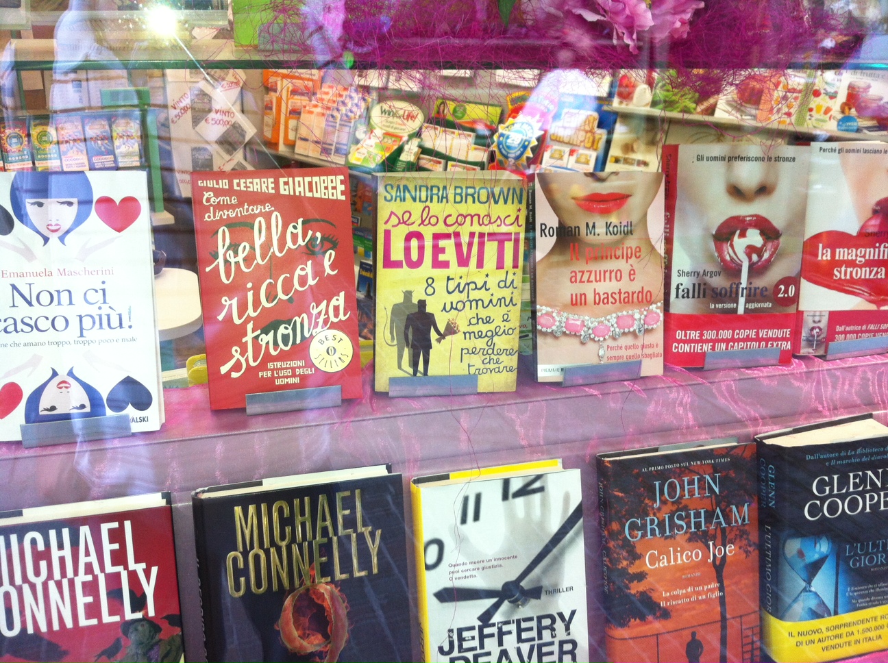 Le letture estive sono spesso, per definizione, leggere. Nel mio recente passaggio in trentino mi sono fermato a soffermarmi, con orrore, presso la vetrina di cui vi metto l’immagine in fondo. C’era questo fantastico ripiano con libri per donne tribolate:
