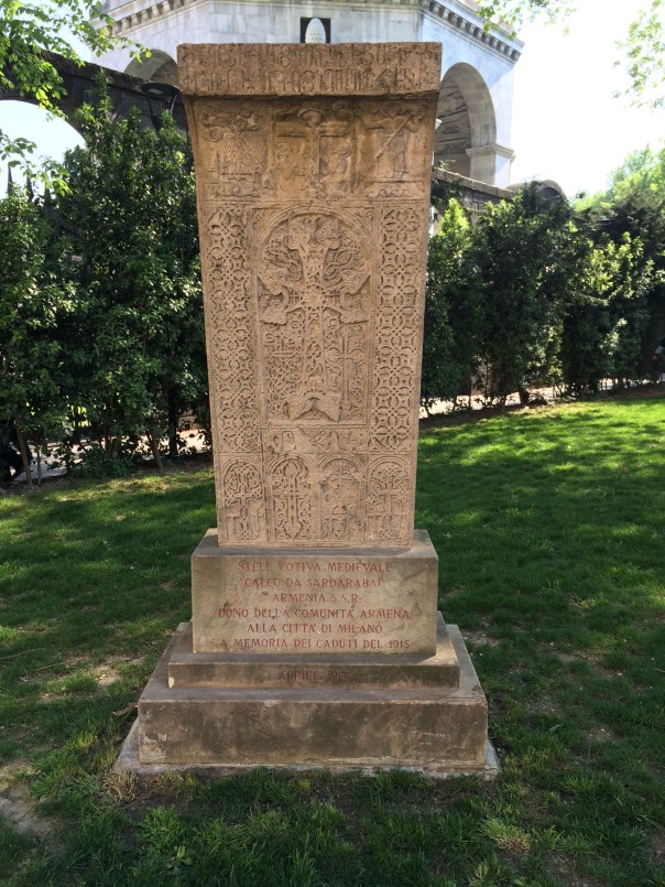 Oggi si commemora il centenario del genocidio armeno. Purtroppo non sono riuscito a deporre un fiore come mi ero prefisso ma almeno, tra un’emergenza e l’altra di una folle giornata lavorativa, sono riuscito a passare “per un saluto” alla stele che sta a fianco della cattolica. Non a caso fu donata nel 1986 dalla comunità armena in ricordo delle vittime del 1915.