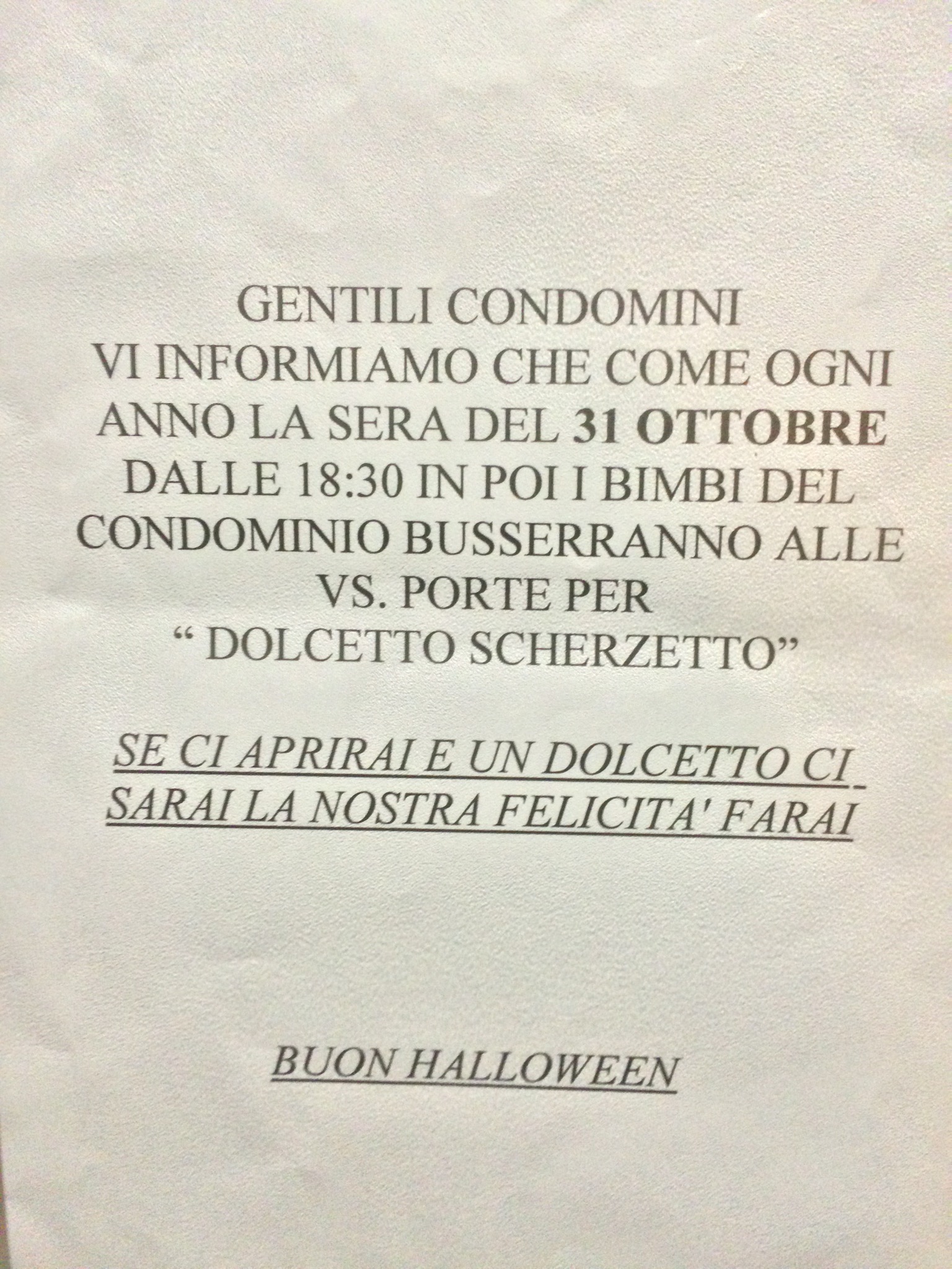 Speravo di averla scampata quest’anno. Non c’erano avvisaglie. Non c’era stato il solito volantino per indire la riunione delle mamma. Insomma, pensavo di aver sfangato il famigerato halloween condominiale. Invece no. Ieri sera è apparso il volantino che vi ripropongo qui sotto. Mannaggia a voi! Avvisare prima? Ora mi tocca ingegnarmi per riuscire a recuperare qualche dolcetto prima di arrivare a casa, col rischio che poi (come lo scorso anno) non passi nessuno e mi restino lì in eterno. Piccoli problemi per non fare figuracce sociali in condominio.