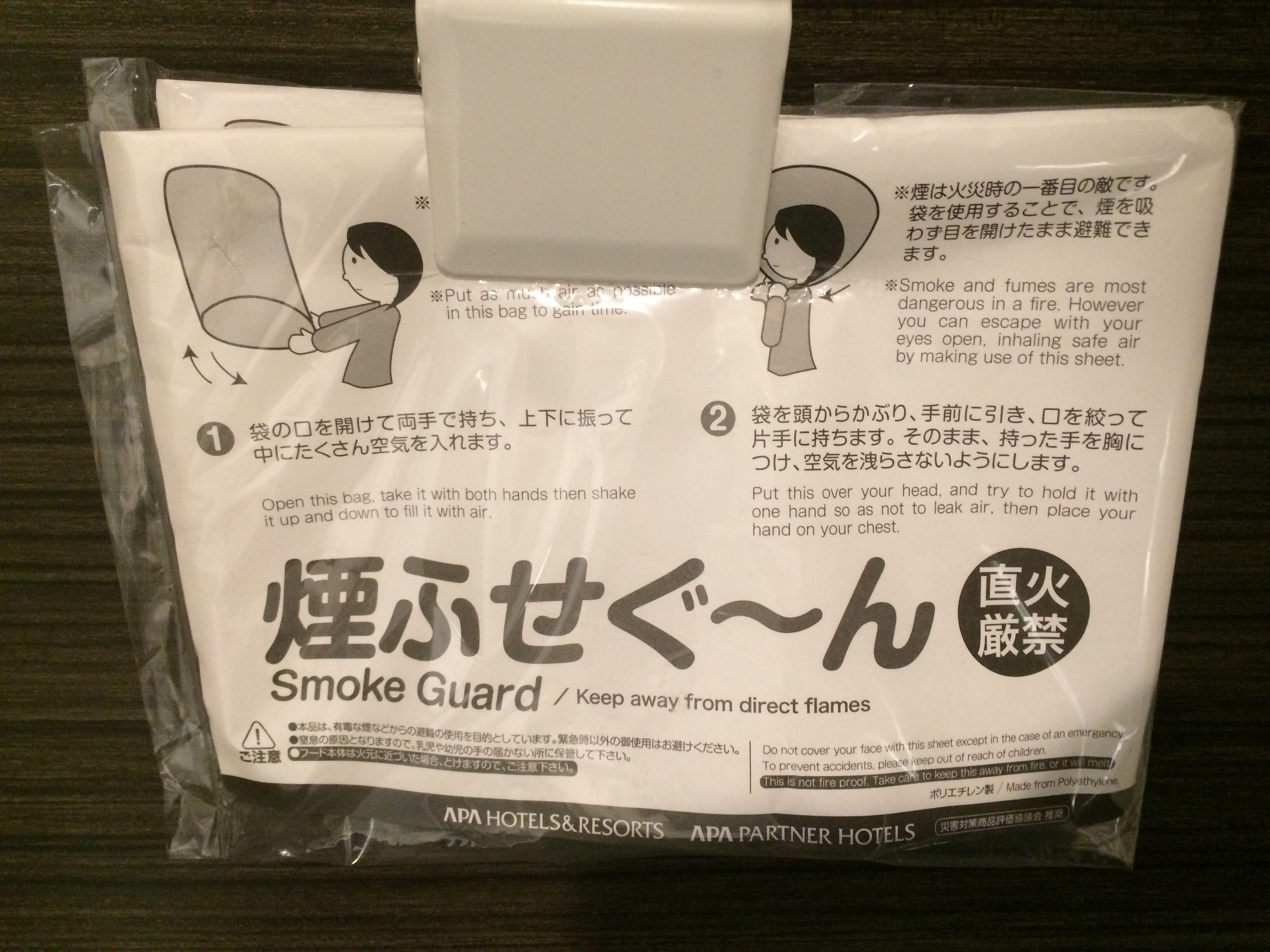 Il Giappone è pieno di oggetti strani, almeno agli occhi di noi occidentali. Uno di questi l’ho visto in diverse camere di hotel e lo vedete nella foto. In pratica si tratta, da quel che ho capito dalle immagini, di un sacchetto da mettere in testa in caso d’incendio per non soffocare. Può anche essere interpretato in modo opposto: un comodo sacchetto per suicidarsi soffocandosi…