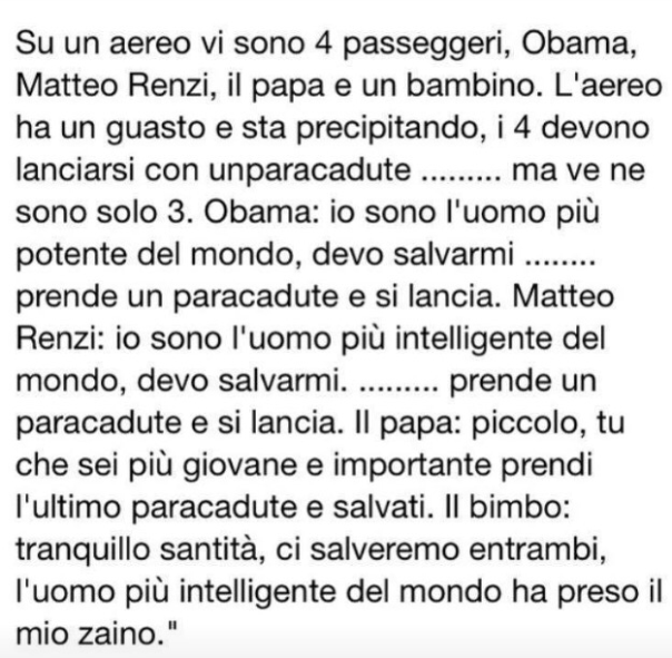 Che piaccia o no Renzi su alcune cose ha oggettivamente ragione. Qualcuno potrà obiettare che anche un orologio rotto segna l’ora esatta almeno due volte al giorno. Ok, non mi interessa addentrarmi in questa diatriba. Quello su cui secondo me ha ragione è che in Italia ci sono troppi professionisti del disfattismo. Ieri stavo leggendo un gruppo di Facebook dedicato al mio paese, Pero. Noi siamo praticamente attaccati all’inceneritore Amsa di Figino. Fino a che non mi dimostreranno il contrario, secondo me uno più moderni e sicuri. Su questo gruppo uno pubblicava una foto di una fumata bianca, lamentandosi della qualità dell’aria. Quando qualcuno (per fortuna c’è chi mi ha anticipato…) gli ha fatto notare che si trattava solo di vapore acqueo, questo ha replicato “allora fattelo tu un aerosol 24 ore al giorno e vediamo quanto ti fa bene”. Insomma, tutto è uno schifo, tutto va male, tutto dovrebbe essere a carico di altri e mai a carico proprio.