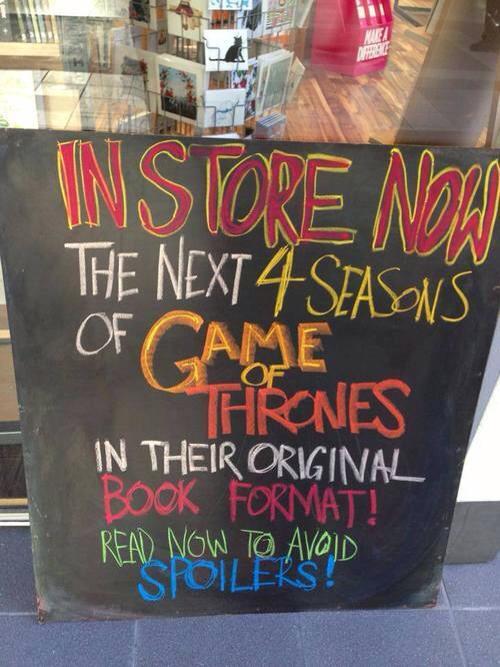 No, non parlo di tuning automobilistico ma di un problema che affligge chi, come me, è un appassionato di serie TV. Lo spoiler è quando qualcuno ti racconta qualcosa che succederà in una puntata che devi ancora vedere. In rete una persona che conosco ha condiviso questa foto, l’ho trovata geniale. Qualcuno potrebbe obiettare che in Game of Thrones la trama della serie Tv si discosta in parte da quella dei libri… E’ un problema molto sentito da noi nerd/geek al punto che The Big Bang Theory gli ha dedicato una puntata.