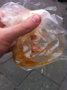Rigorosamente consumato da un chiosco per strada, è una sorta di trippa fatta con lo stomaco (credo bovino). Approfittando dell’occasione per salutare gli amici veggie e vegan che mi toglieranno ora definitivamente io saluto, devo dire che è una pietanza che riscrive il concetto di unteria. Basta vedere io sacchetto di plastica in cui lo servono e i resti che vi rimangono a fine panino.