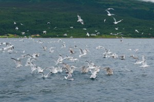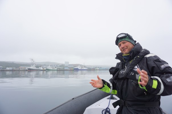 Dopo una giornata, quella dell'8, dedicata al giro di Tromso, compreso il suo lato B, di cui parlerò in un altro post, il 9 abbiamo riempito la mattinata con un giro in canotto del fiordo e delle isole intorno alla città. Purtroppo il tempo non ci ha assistito: nebbia e pioggerellina non son il massimo per una gita del genere. L'aspetto positivo è che tutto il battello era solo per noi. In teoria potevano anche rimbalzarci, visto che la gita era per un numero variabile tra i 4 e i 16, però non si sono scomposti e ci hanno fatto uscire lo stesso. Sul gommone sei a cavalcioni di una serie di sedute, con un supporto davanti per reggerti. Tutto in totale sicurezza. Tanto più che il mare era veramente una tavola. Questo non ha impedito al nostro pilota (nella foto durante una pausa) di fare un po' di evoluzioni in acqua per movimentare la gita. Bardati come per una gita polare (eravamo pur sempre all'aperto e si viaggiava a 80 km/h) ci siamo goduti la nostra privatissima gita. Non si sono visti animali, se non uno stormo di gabbiani, intento a cibarsi in acqua e che abbiamo bellamente disturbato.