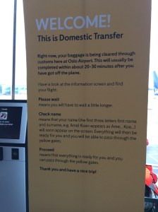 La prima spigolatura interessante del nostro viaggio norvegese, l’abbiamo all’aeroporto di Oslo. Se sei un passeggero senza altra destinazione, puoi dirigerti tranquillamente al ritiro bagagli. Se hai un volo in coincidenza e non hai bagaglio imbarcato idem. La cosa interessante capita se, come noi, hai un bagaglio che (speri) viaggi fino alla tua destinazione finale. C’è un filtro dove si aspetta davanti ad un monitor, quando il tuo bagaglio è scaricato, controllato e convogliato verso il nuovo volo, escono le tue iniziali sul monitor e puoi proseguire verso i gate domestici. Singolare, con una sua utlità ai fini della sicurezza aeroportuale ma, secondo me, inapplicabile in un aeroporto con un flusso maggiore di passeggeri. Ce li vedete centinaia di italiani in attesa di vedere le proprie iniziali su un monitor? Le resse (e le risse) ai nastri bagagli sarebbero ricordate come simpatiche scampagnate.